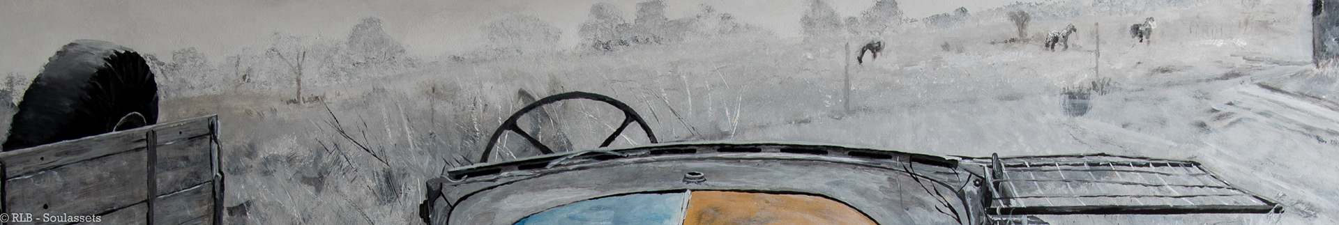 As the artwork features five tires, coming up with the title was easy, I just split the town’s name in two with a space. Thereby adding fun by leaving the artwork with a double meaning for the word “tire”. In the background of the painting three horses graze, whilst the horseless carriage tires in the long wheat grass.